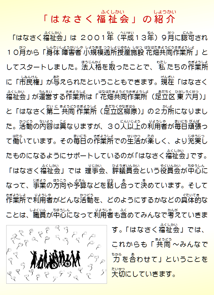 理事長(りじちょう)施設長(しせつちょう)のあいさつ はなさく福祉会(ふくしかい)紹介(しょうかい) 花畑共同作業所(はなはたきょうどうさぎょうしょ)歴史紹介(れきししょうかい) おねがい 毎日(まいにち)充実(じゅうじつ)して